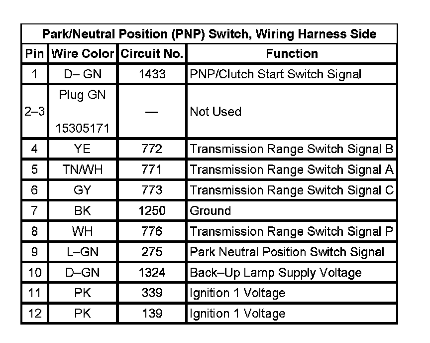 Park/Neutral Position (PNP) Switch, Wiring Harness Side: