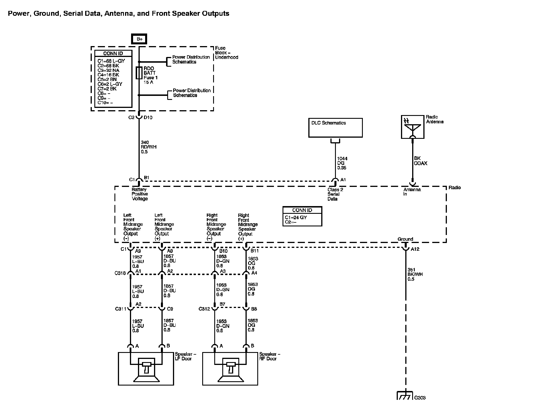 Power, Ground, Serial Data, Antenna, and Front Speaker Outputs