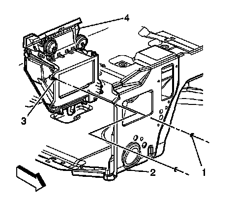 2. Remove the heater assembly retaining nuts (1) from the engine compartment.