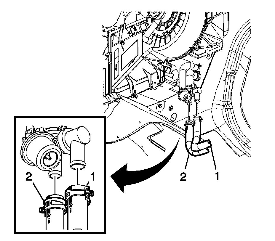 5. Remove the outlet heater hose (2) from the coolant bypass valve.