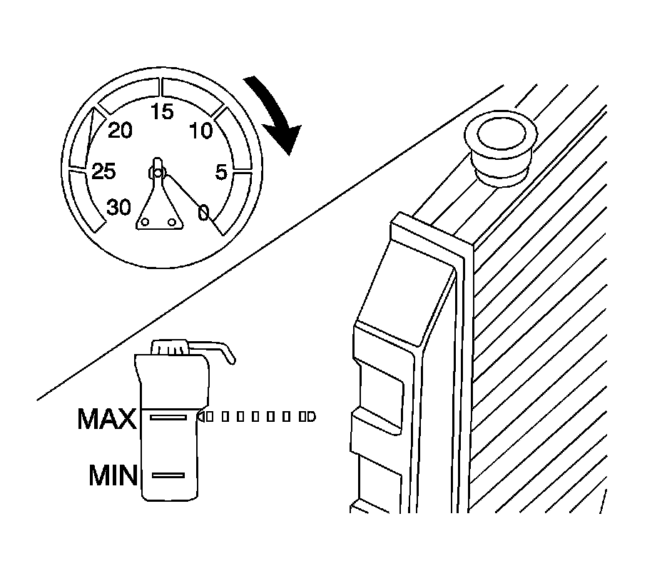 Caution: With a pressurized cooling system, the coolant temperature in the radiator can be considerably higher than the boiling point of the solution at atmospheric pressure. Removal of the surge tank cap, while the cooling system is hot and under high pressure, causes the solution to boil instantaneously with explosive force. This will cause the solution to spew out over the engine, the fenders, and the person removing the cap. Serious bodily injury may result.
