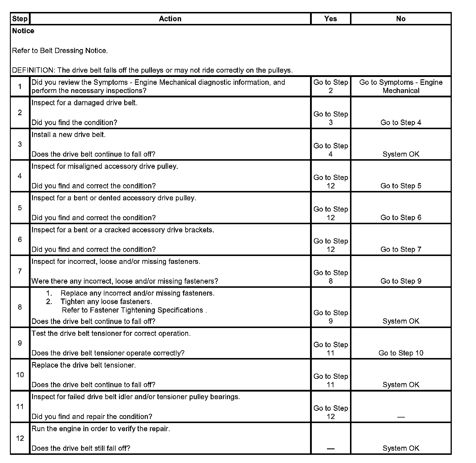 An extra load that is quickly applied or released by an accessory drive component may cause the drive belt to fall off. Verify that the accessory drive components are operating properly.