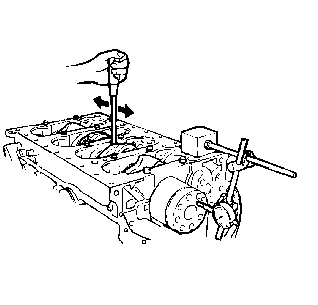 2. Measure crankshaft end play using J7872. The production value is 0.04 - 0.205 mm (0.0016 - 0.0081 inch) and the service limit is 0.54 mm (0.0213 inch). Replace the thrust bearings upon reassembly if the measured value exceeds the service limit.