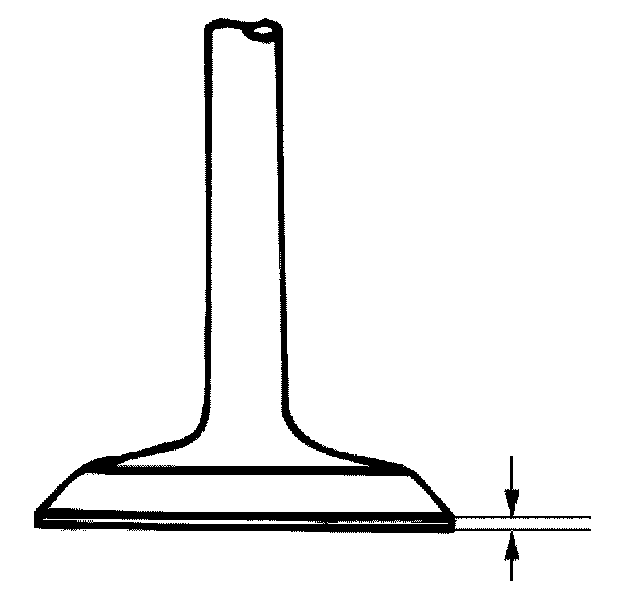1. Measure the valve margin. The intake valve production margin is 1.2 mm (0.0472 inch) and the service limit is 0.88 mm (0.0346 inch). The exhaust valve production margin is 1.0 mm (0.0394 inch) and the service limit is 0.73 mm (0.0287 inch). Replace the valve if the valve margin is below the service limit.