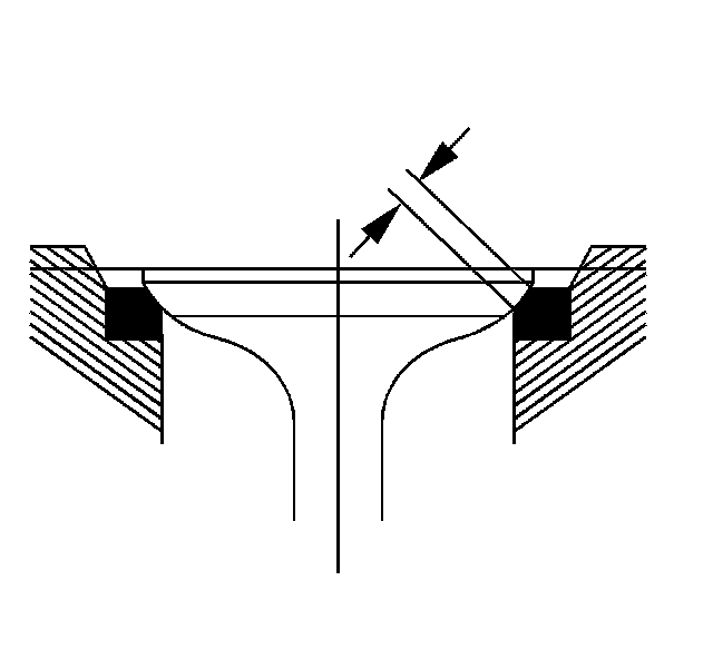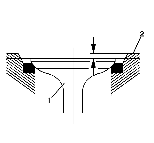 2. Use a depth gauge or a straight edge to measure the valve depression from the cylinder head gasket surface (2). The intake valve depression is 0.6 mm (0.0236 inch) and the service limit is 2.5 mm (0.0984 inch). The exhaust valve depression is 0.9 mm (0.0354 inch) and the service limit is 2.0 mm (0.0787 inch). Recondition the valve seat if the valve depression is above specifications.