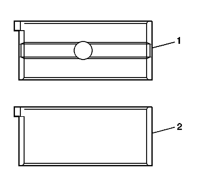 2. Install the lower crankshaft bearings into the crankshaft bearing caps. The bearing halves to be inserted into the crankshaft main bearing caps do NOT have an oil hole or groove in the bearing (2).