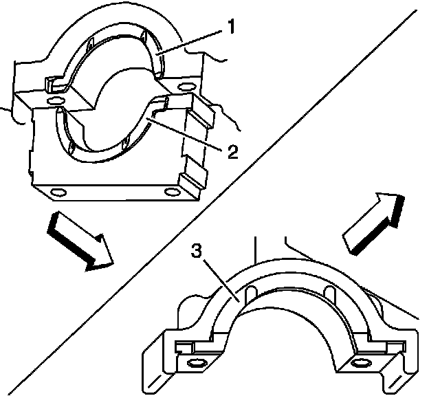 3. Install the upper thrust bearings to the cylinder block. There are two thrust bearings (1 and 3) in the cylinder block and one lower thrust bearing in the No. 5 crankshaft bearing cap (2).