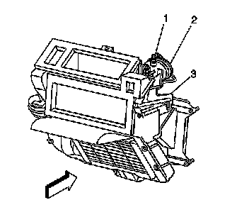 5. Depress the clip and remove the defrost actuator (2) from the heater assembly.