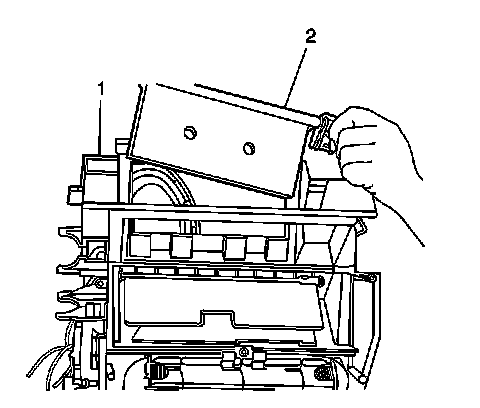 6. Remove the defroster door (2) door from the heater assembly (1).