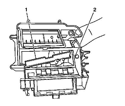 7. Remove the lower mode door (1) to the heater assembly (2).