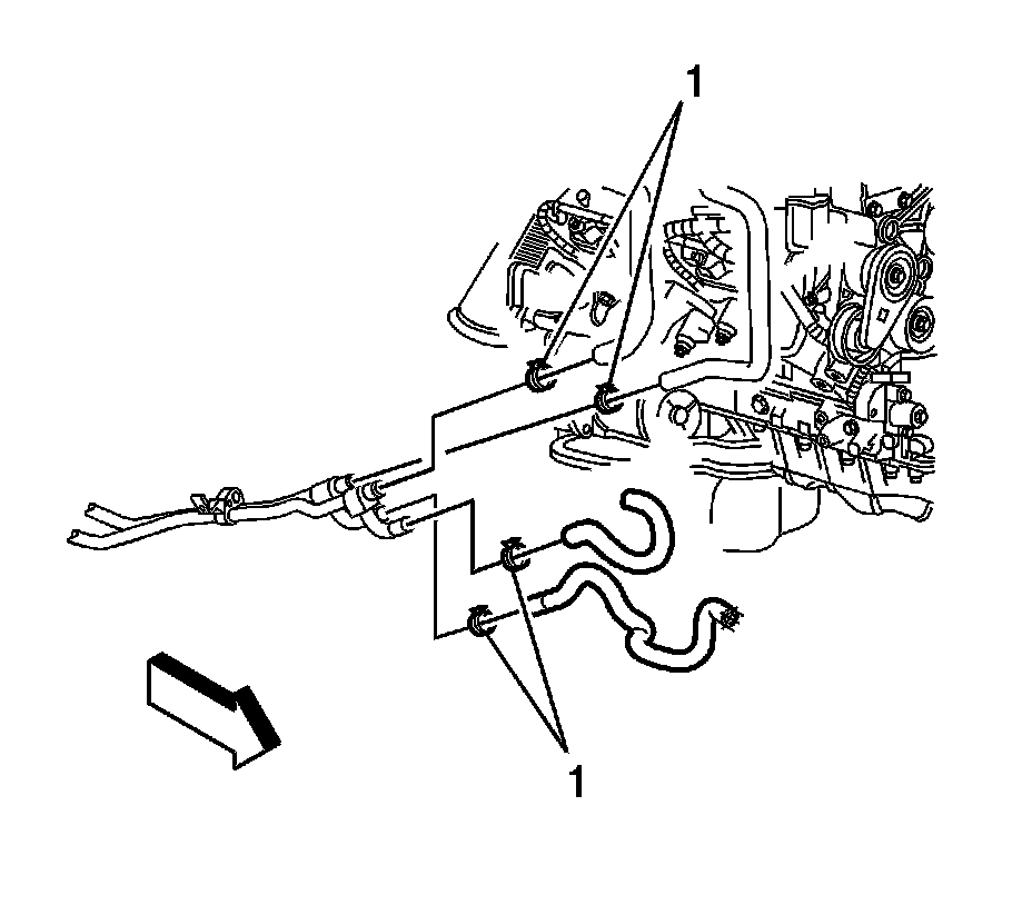 3. Install auxiliary a/c and heater hose bracket nuts (3) and tighten to 7 Nm (6 lb in).