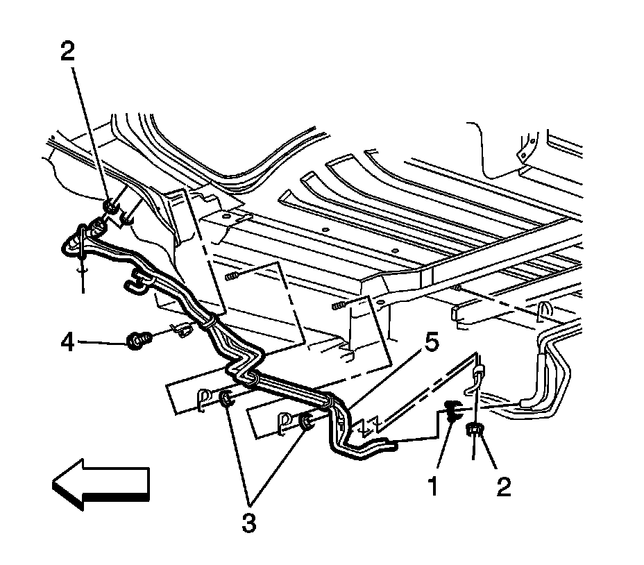 2. Install auxiliary a/c and heater hose bracket bolt (4) and tighten to 6 Nm (5 lb in).