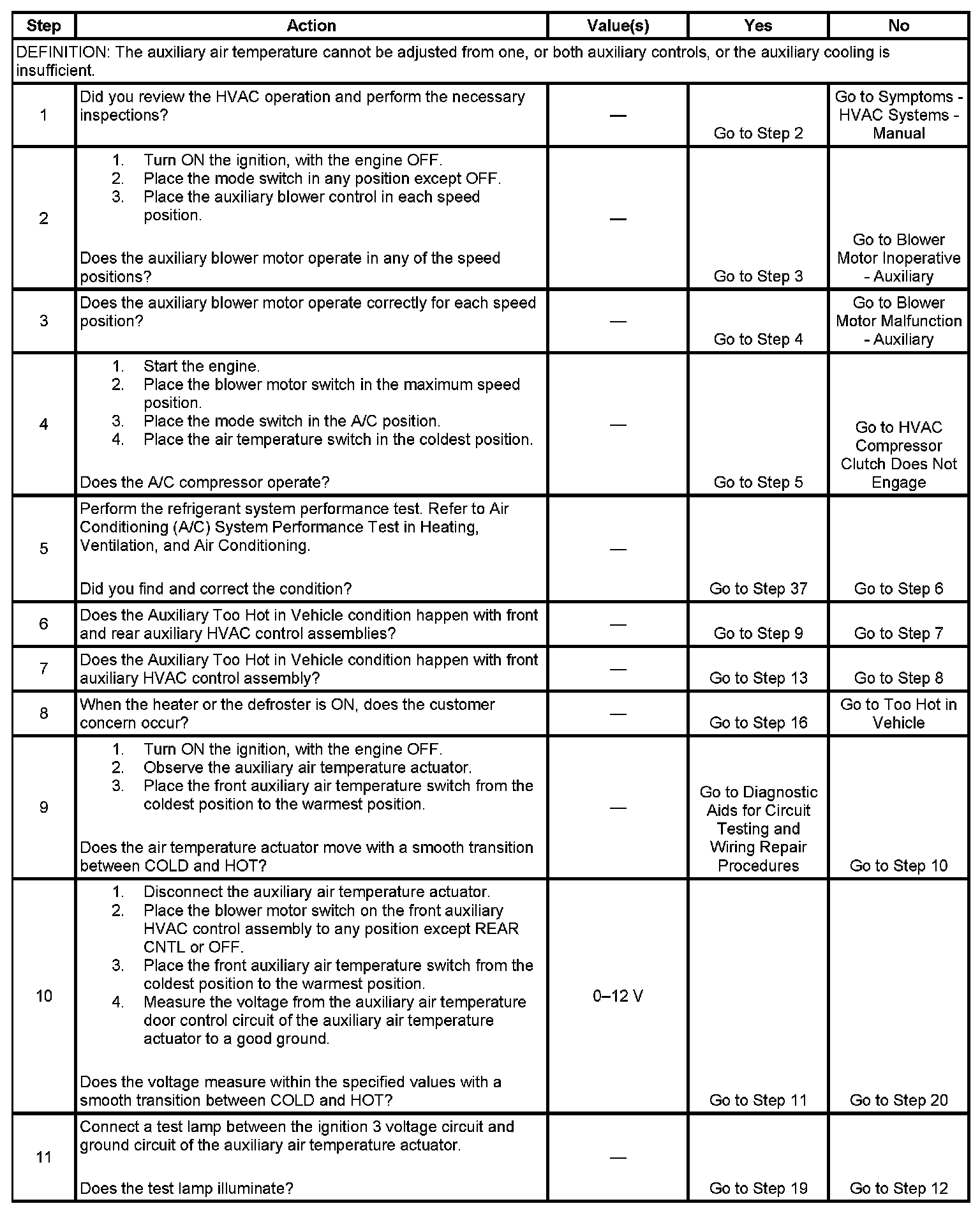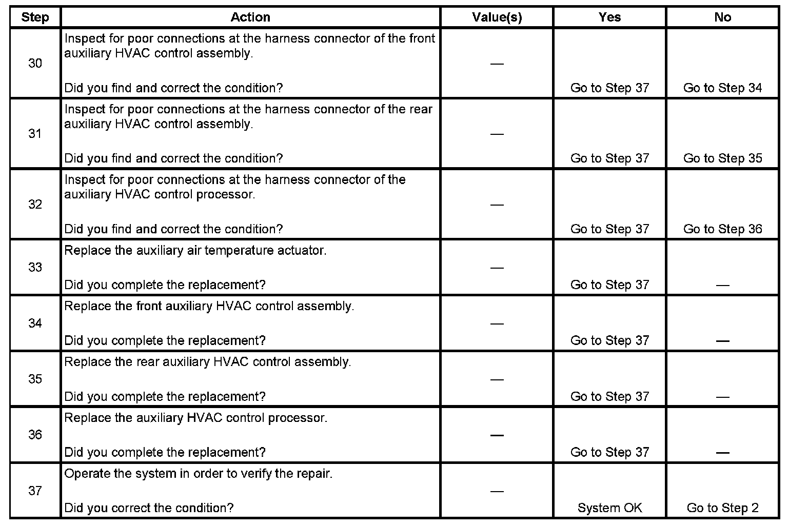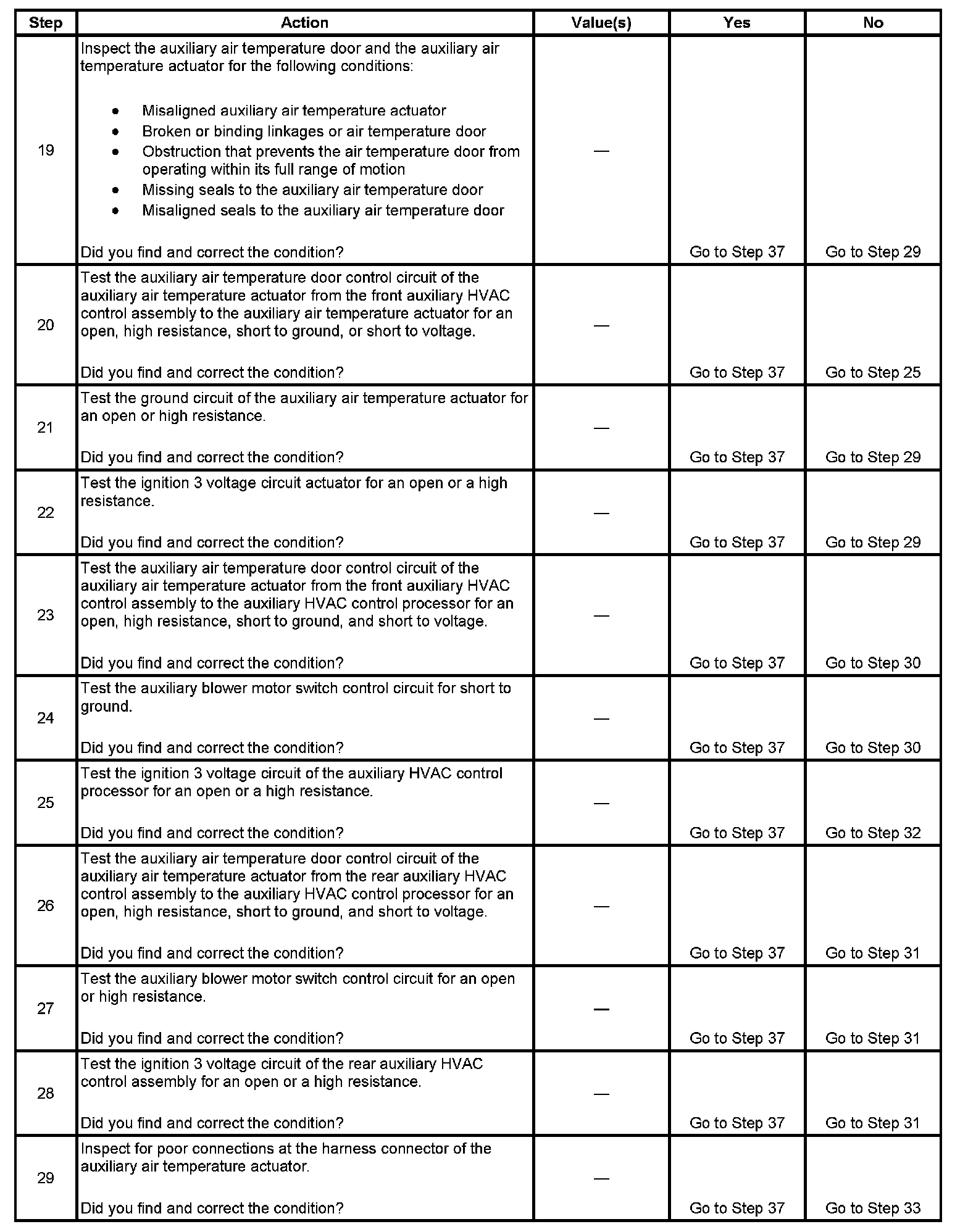 20. This step checks the complete auxiliary air temperature door control circuit, from the front HVAC control assembly, through the auxiliary HVAC control processor to the auxiliary air temperature actuator.