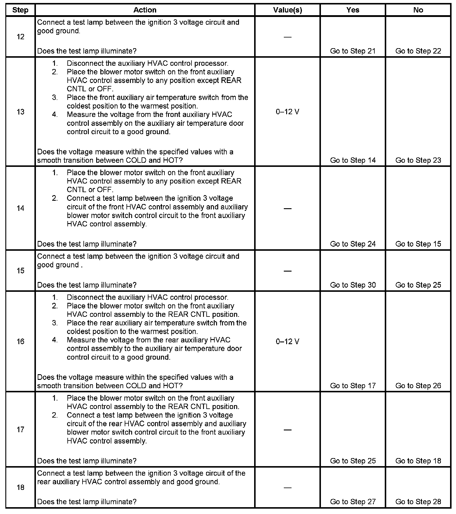 16. The voltage will vary between 0-12 volts during normal operation. The rear auxiliary HVAC control assembly connector must be connected during this step. This checks for proper operation of the air temperature actuator door control circuit and the rear auxiliary HVAC control assembly.