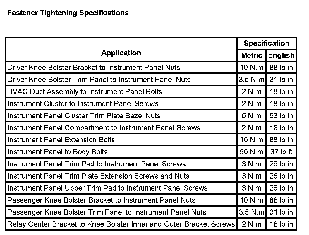 Instrument Panel, Gauges and Warning Indicators: Specifications