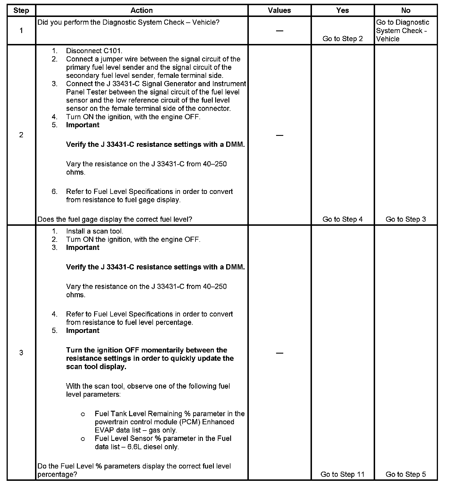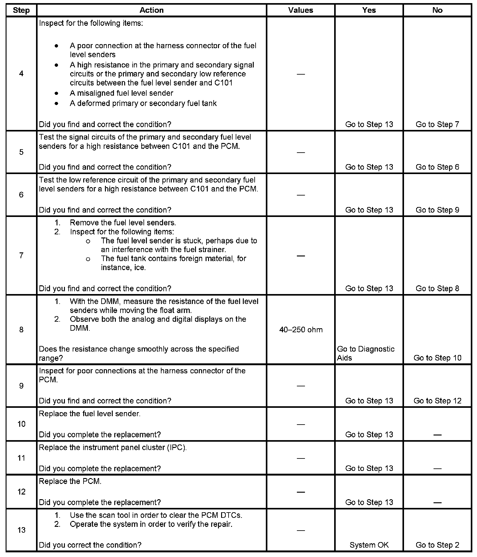 3. This step tests for a high resistance in the signal circuit and the low reference circuit of the fuel level sensor.