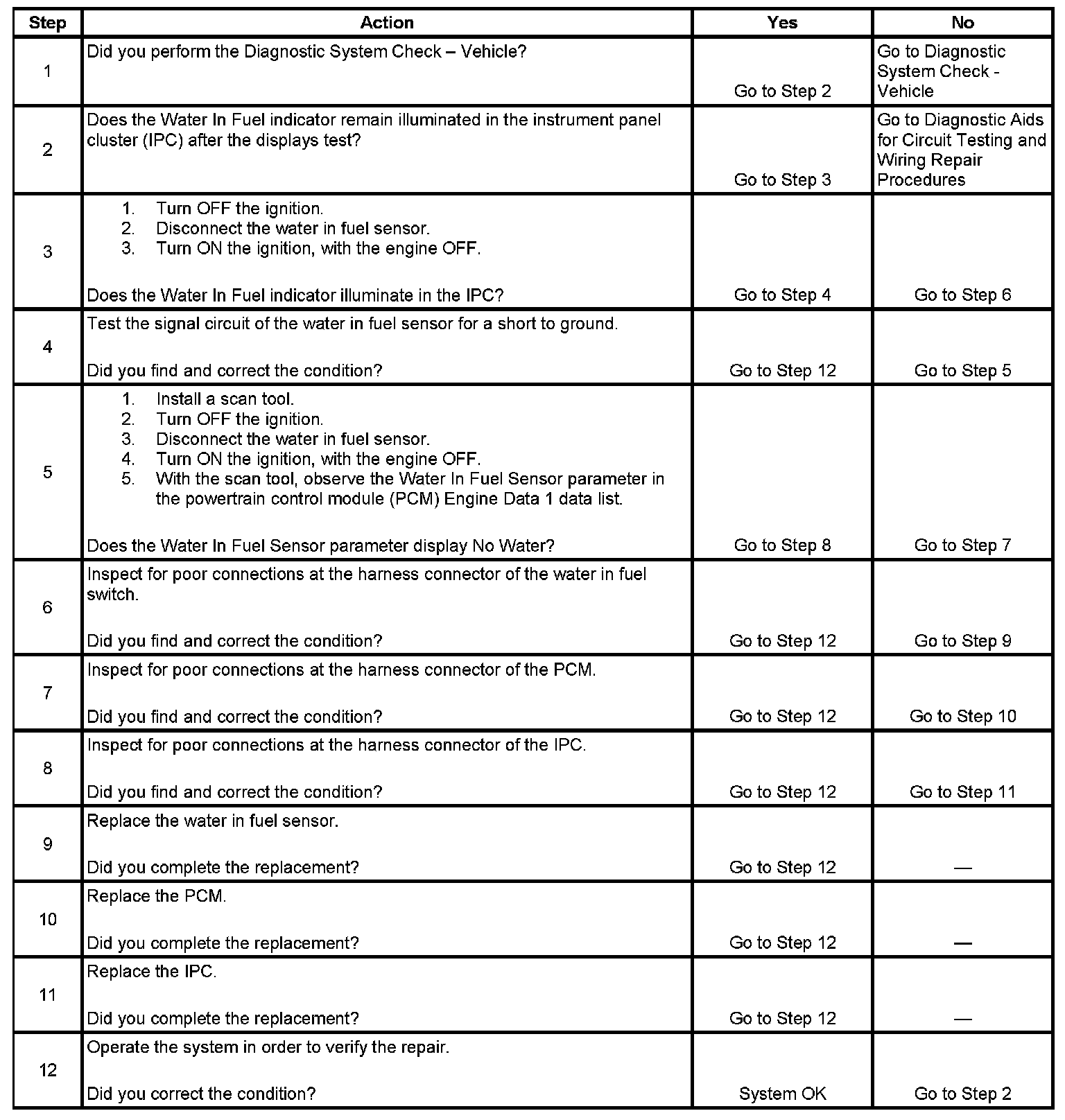 - The water in fuel sensor illuminates the Water in Fuel message when there is water in the fuel system. Perform the Water in Fuel Draining procedure before performing the following test steps to accurately determine if a malfunction exists. Refer to Water-in-Fuel Draining Procedure.