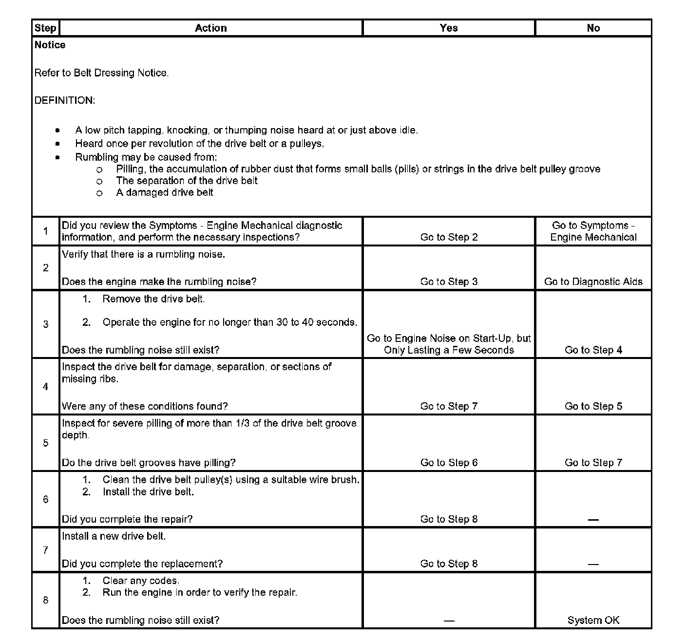 If, after replacing the drive belt and completing the diagnostic table, the rumbling is only heard with the drive belt installed, there might be an accessory drive component failure. Varying the load on the accessory drive components may aid in identifying which component is causing the rumbling noise.