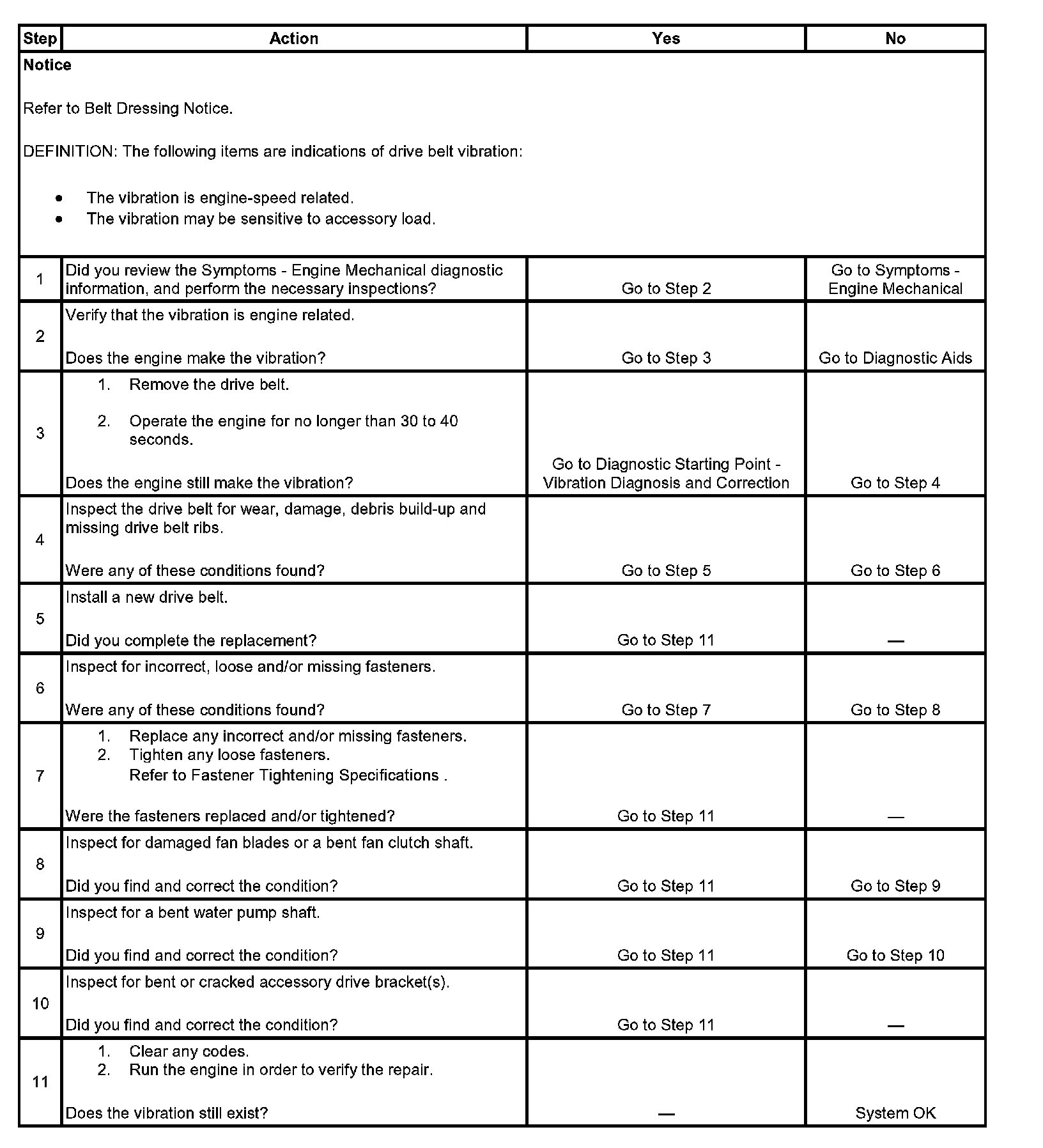 3. This test is to verify that the drive belt or accessory drive components may be causing the vibration. Remove the drive belt and operate the engine for a few seconds, this will verify if the vibration is related to the drive belt or not. With the drive belt removed the water pump will not operate and the engine may overheat. Also diagnostic trouble codes (DTC's) may set when the engine is operated with the drive belt removed.