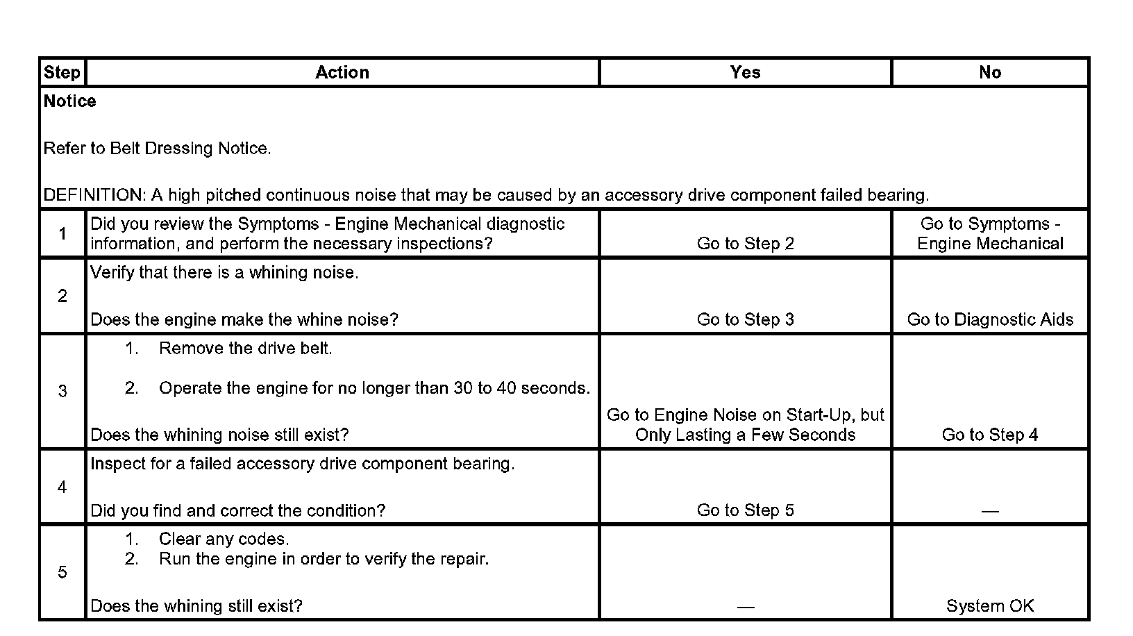 3. This test is to verify that the whine is being caused by the accessory drive components. Remove the drive belt and operate the engine for a few seconds, this will verify if the whining noise is related to the accessory drive component. With the drive belt removed the cooling fan will not operate and the engine may overheat. Also diagnostic trouble codes (DTC's) may set when the engine is operated with the drive belt removed.
