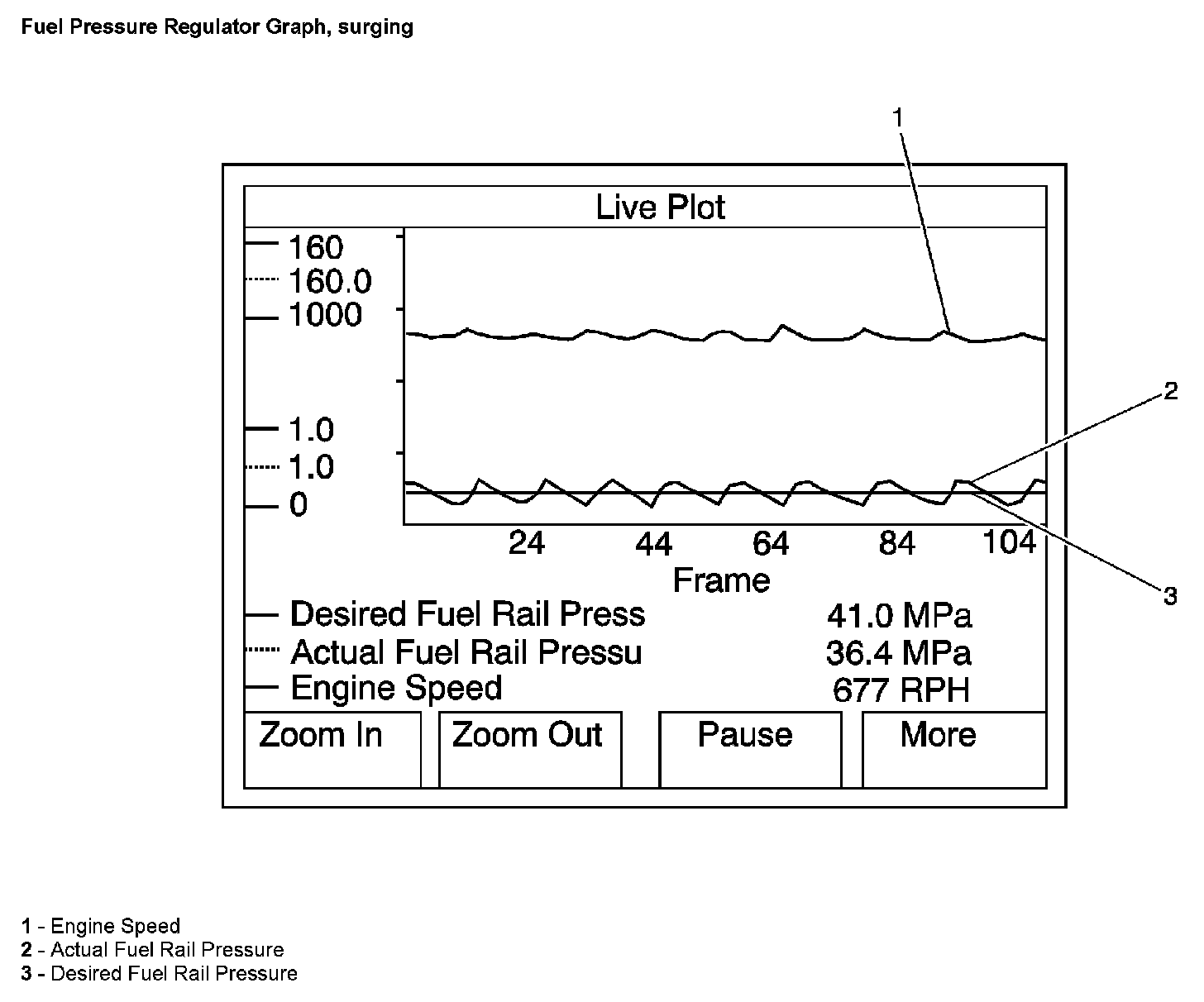 The Fuel Pressure Regulator graphing procedure offers valuable information on regulator performance by comparing desired and actual fuel rail pressure. An almost perfect comparison between actual rail pressure and desired rail pressure is found on a fairly new, low mileage engine. A minor ripple is acceptable behavior for the fuel rail pressure regulator and is seen on high mileage engines. A "shark tooth" fluctuation in actual fuel rail pressure indicates a sticking pressure regulator.