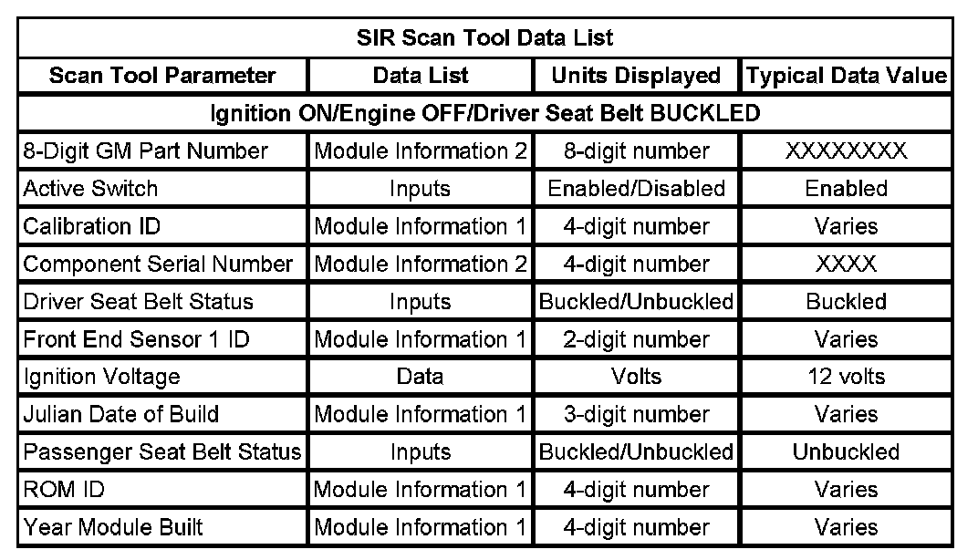 Use the SIR Scan Tool Data List as directed by a diagnostic table or to supplement the diagnostic procedures. Begin all of the diagnostic procedures with the Diagnostic System Check - Vehicle. Refer to the Diagnostic System Check - Vehicle. Use the SIR Scan Tool Data List after determining the following:
