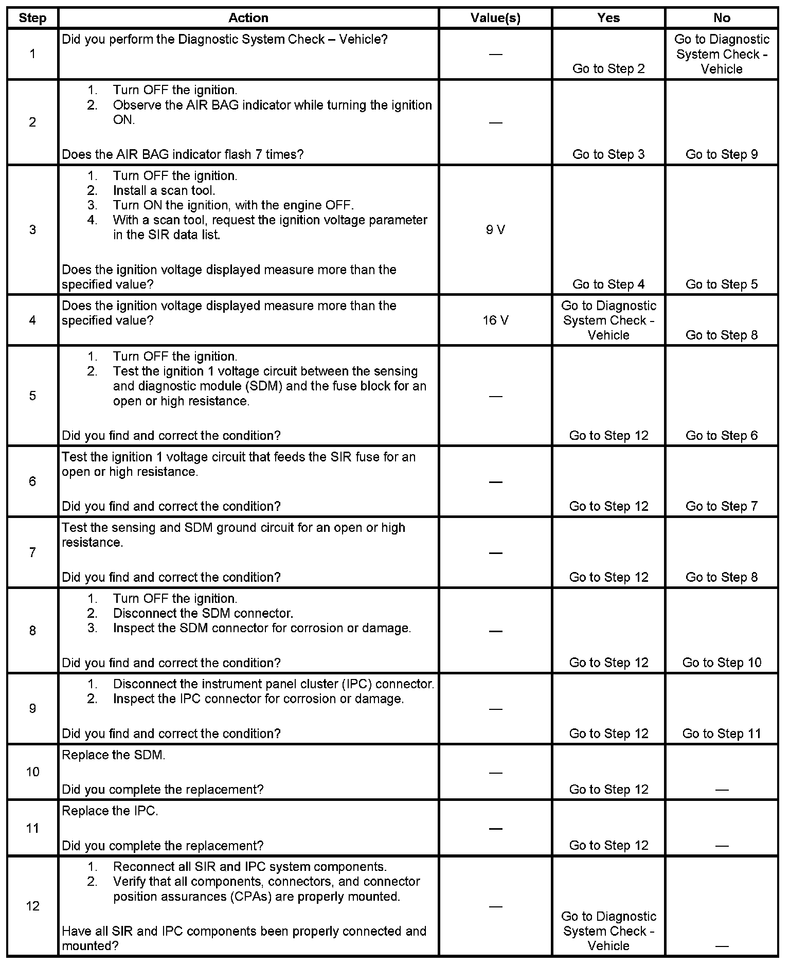 6. This step tests for an open or high resistance in the ignition 1 voltage circuit that feeds the SIR fuse.