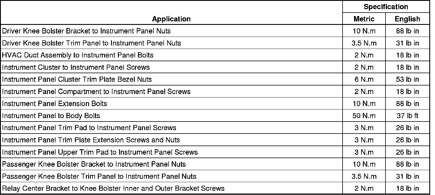 Instrument Panel, Gages, and Console - Fastener Tightening Specifications