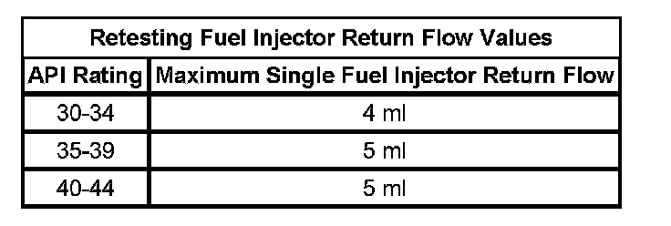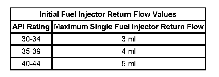 The fuel return from the fuel injectors to the tank will vary based on the API value of the fuel. Measure the Fuel API with the Diesel Fuel Quality Tester. For this reason the Fuel System Diagnosis - High Pressure Side values will vary for identifying a fuel injector or fuel pump concern. Use the tables when referred to by the diagnostic. The first table is to be used during the initial diagnosis to identify the worst fuel injectors. After the fuel injectors that fail the first part of the test are capped off, the return flow from each uncapped fuel injector must be measured again. This is because the fuel system is returning less fuel to the tank, and thus the fuel pressure is higher during the retest. Failure to use the correct table may result in the replacement of good fuel injectors.