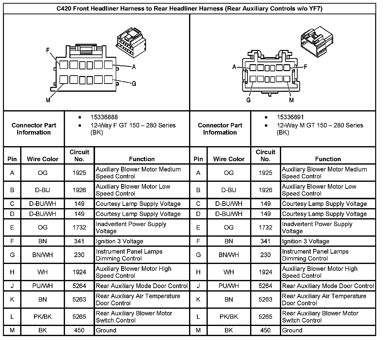 C420 Front Headliner Harness to Rear Headliner Harness (Rear Auxiliary Controls Without RPO Code YF7):