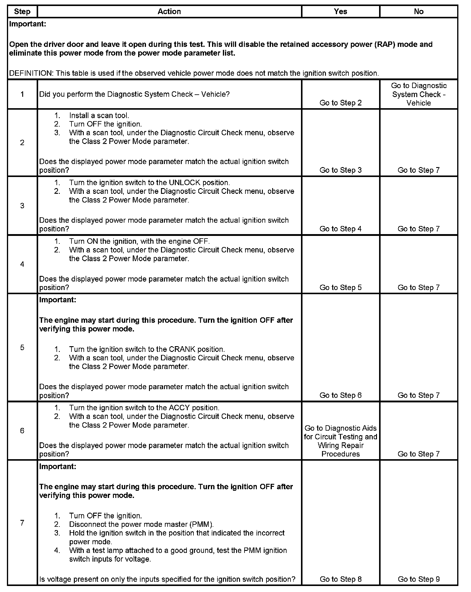 Normal vehicle class 2 communications and module operations will not begin until the system power mode has been identified. Discrete wires from the ignition switch contacts are monitored by the power mode master (PMM) module in order to determine the correct power mode. The PMM communicates the system power mode to all class 2 modules on the class 2 serial data line. Refer to Body Control System Description and Operation to identify which module is the PMM and the applicable power mode look up table.