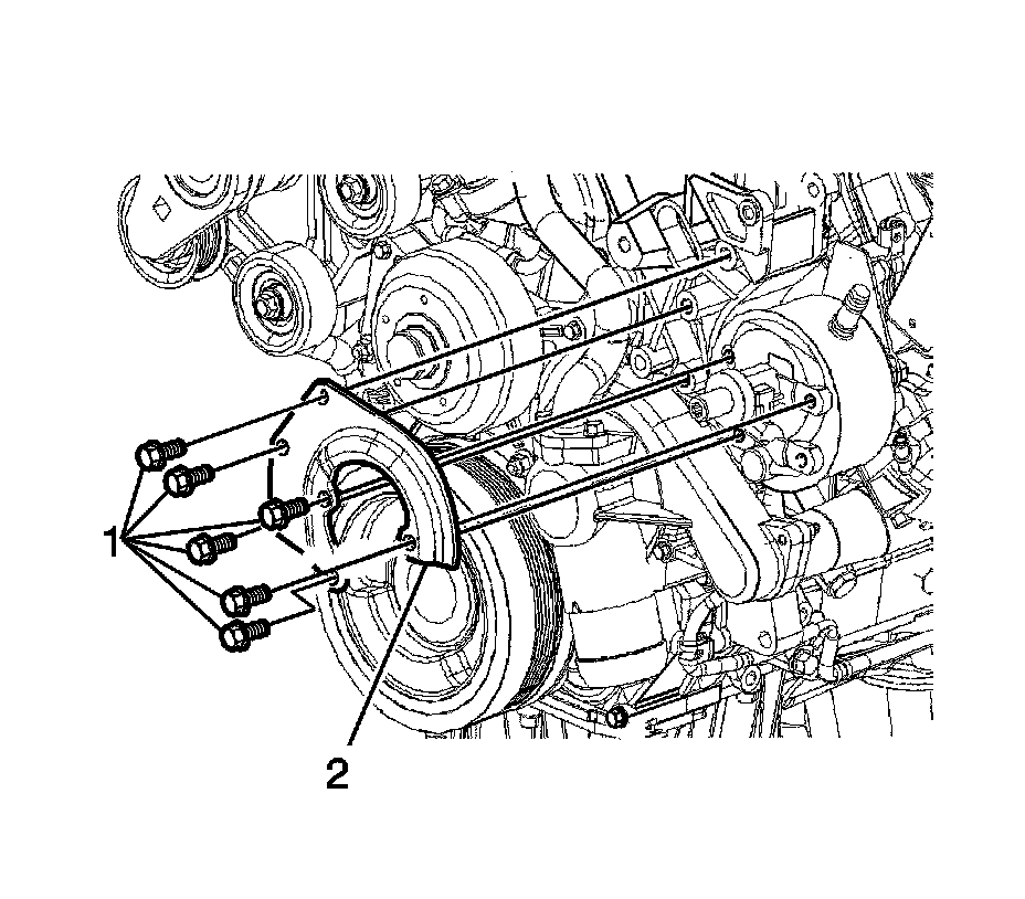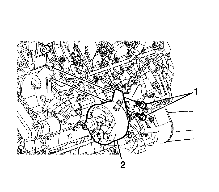 Install the power steering pump rear bracket nuts (1) to the pump studs.