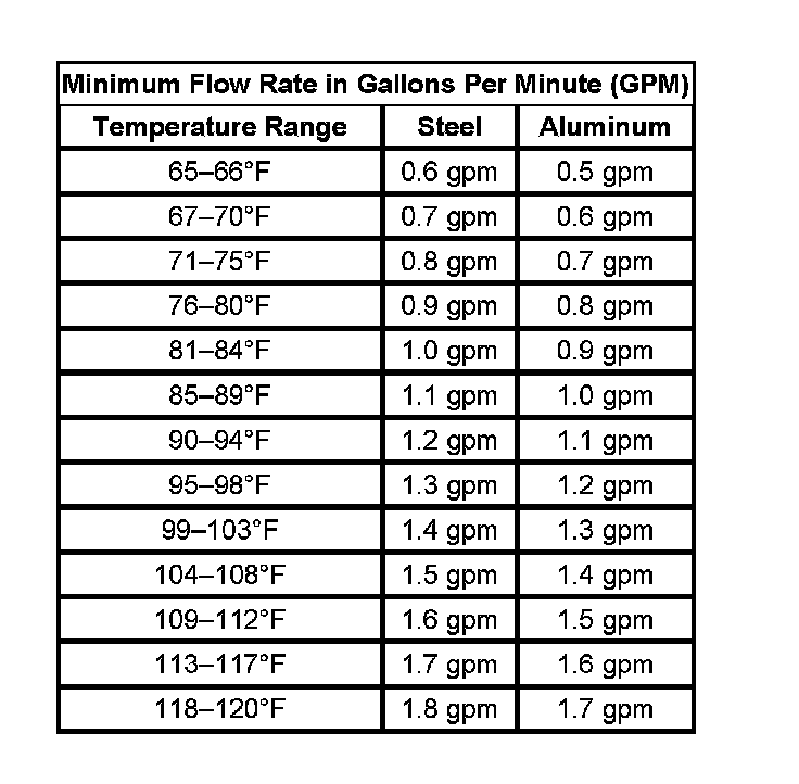 3. Refer to the table below. Using the temperature from step 1, locate on either the Steel MINIMUM Flow Rate table or the Aluminum MINIMUM Flow Rate table the minimum flow rate in gallons per minutes (GPM). Record the minimum flow rate in GPMs and the supply fluid temperature for further reference.