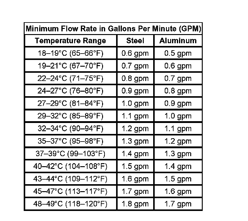 3. Refer to the table below. Using the temperature from Step 1, locate on either the Steel MINIMUM Flow Rate table or the Aluminum MINIMUM Flow Rate table the minimum flow rate in gallons per minutes (GPM). Record the minimum flow rate in GPM and the supply fluid temperature for further reference.