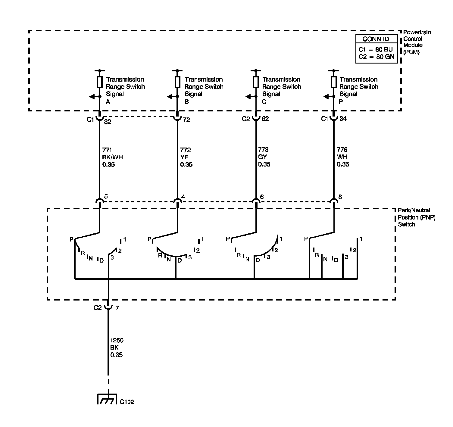 The transmission range (TR) switch is part of the park/neutral position (PNP) and back up lamp switch assembly, which is externally mounted on the transmission manual shaft. The TR switch contains four internal switches that indicate the transmission gear range selector lever position. The powertrain control module (PCM) supplies ignition voltage to each switch circuit. As the gear range selector lever is moved, the state of each switch may change, causing the circuit to open or close. An open circuit or switch indicates a high voltage signal. A closed circuit or switch indicates a low voltage signal. The PCM detects the selected gear range by deciphering the combination of the voltage signals. The PCM compares the actual voltage combination of the switch signals to a TR switch combination chart stored in memory.