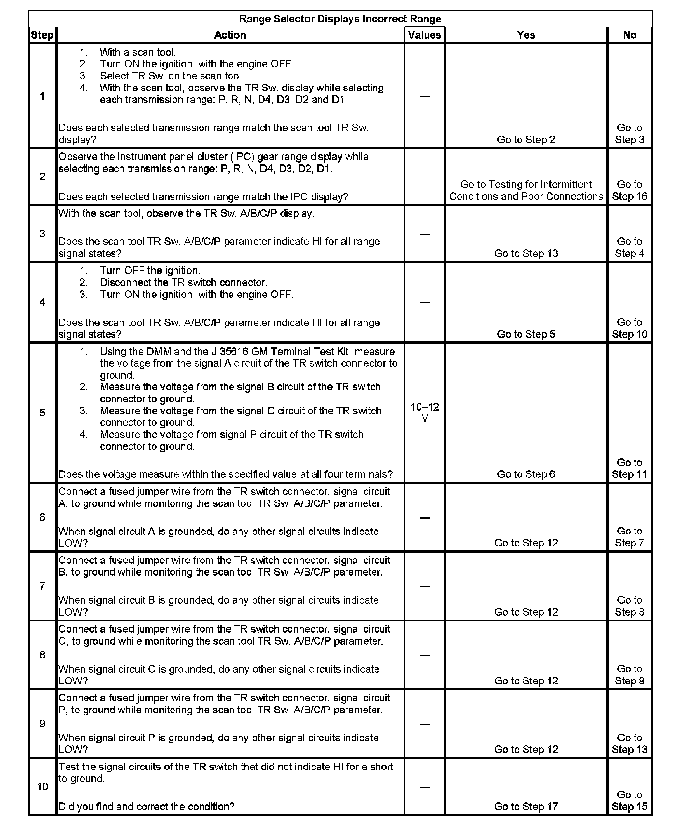 Refer to Transmission Range Switch Logic for valid combinations of switch signal circuits A, B, C and Parity. On the table, HI indicates an ignition voltage signal. LOW indicates a zero voltage signal.