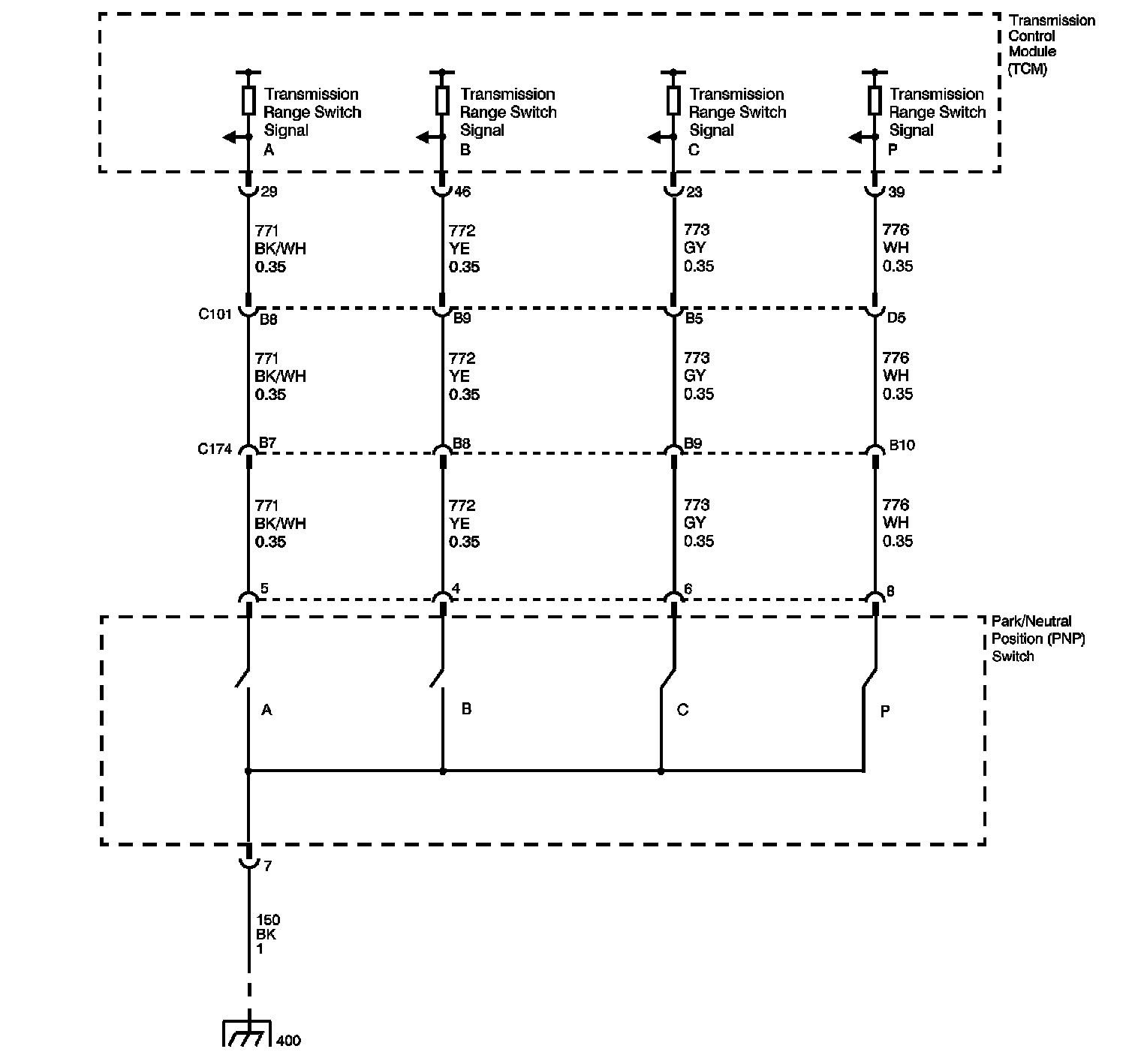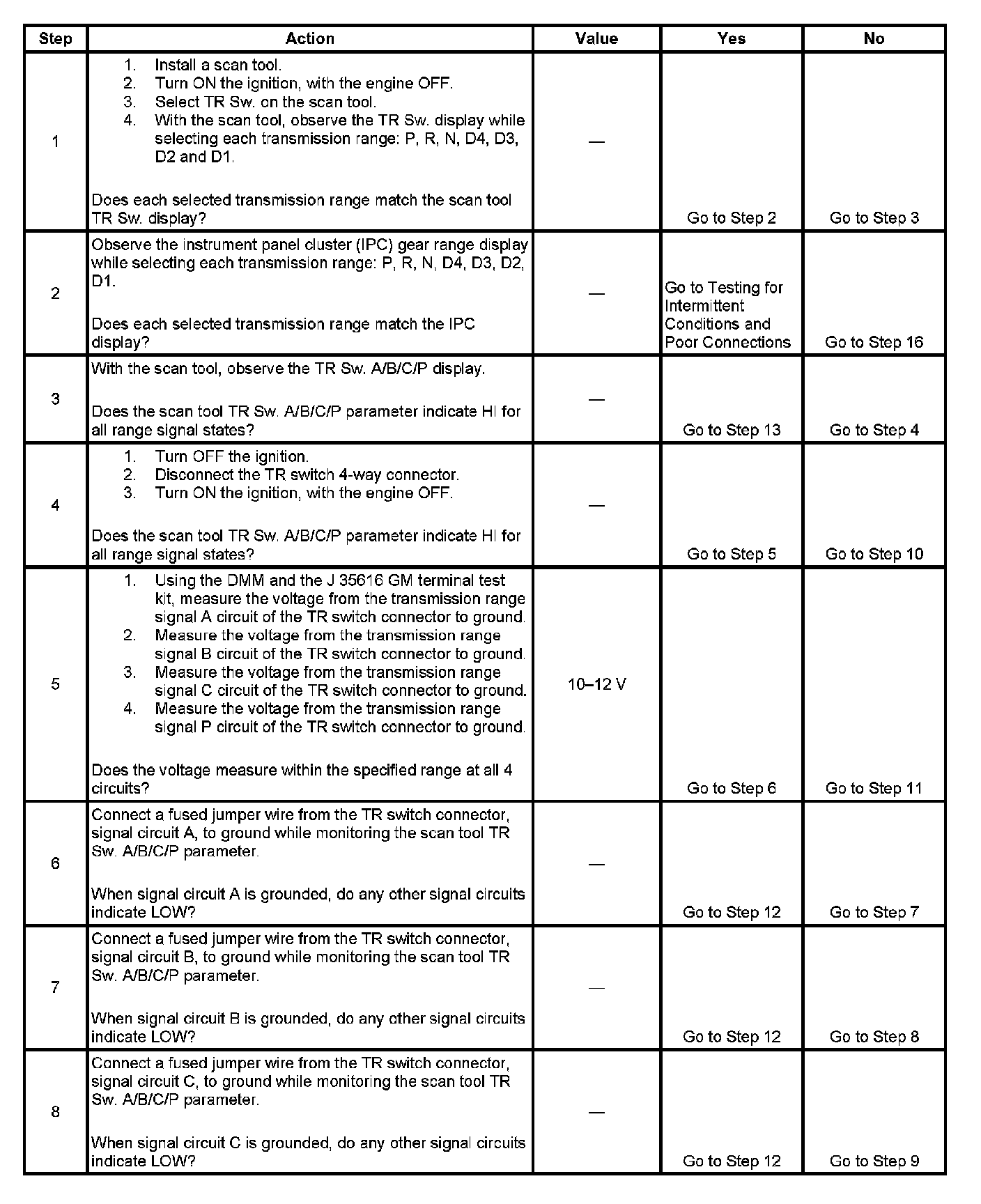 Refer to Transmission Range Switch Logic for valid combinations of switch signal circuits A, B, C and Parity. On the table, HI indicates an ignition voltage signal. LOW indicates a 0 voltage signal.
