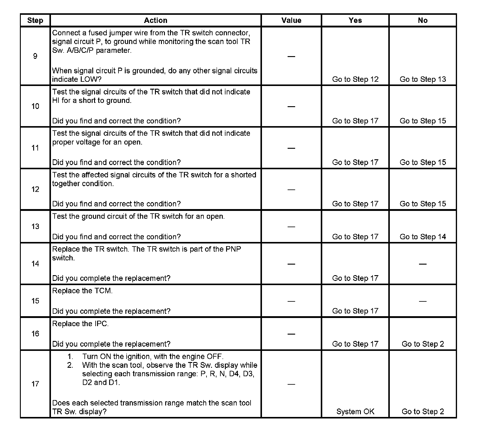 4. By disconnecting the TR switch, the ground path of all TR switch circuits is removed and the TCM should recognize all circuits as open. The scan tool should display HI for all range signal states.