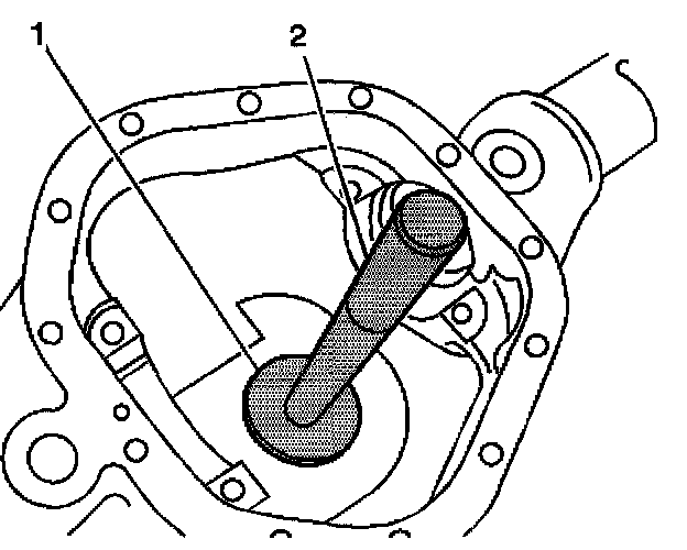 8. Remove the inner pinion bearing cup and the oil deflector using the J45703, 9.75 inch axle, or the J45706, 10.5 inch axle (2) and the J42176 (1).