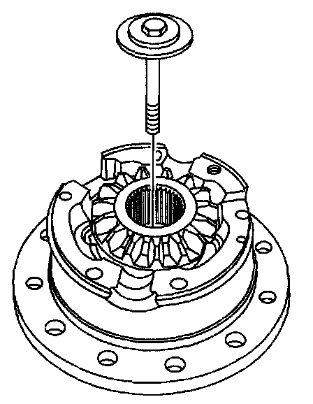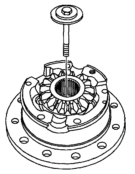 15. Clamp the differential side gear cam unit and clutch disc assembly in place using a set of washers, a nut, and a bolt long enough to hold the side gear in place.