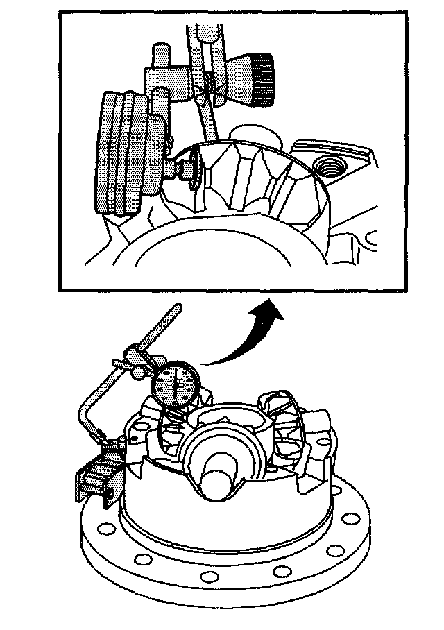 The backlash between the differential pinion gear and locking differential side gear should be between 0.051 - 0.203 mm (0.002 - 0.008 inch).
