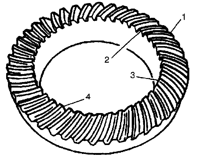 Gear Tooth NomenclatureThe side of the ring gear tooth which curves outward, or is convex, is the drive side (4). The concave side is the coast side (3). The end of the tooth nearest the center of the ring gear is the toe end (2). The end of the tooth farthest away from the center is the heel end (1).