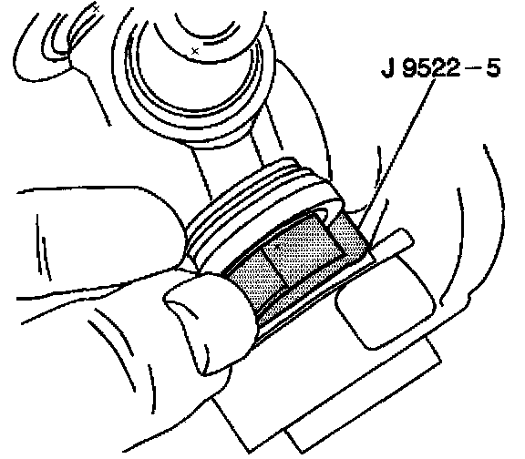 7. If you do not completely remove the bearing cup, lift the cross and insert J9522-5 between the seal and the bearing cup you are removing. Continue pressing the bearing cup out of the yoke.