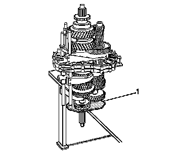 38. Using the J 44730 (2) and the J 44707 (1) on the countershaft, remove the 6th gear synchronizer hub and 6th gear bushing.