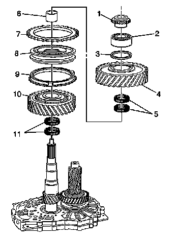 Install the J 44730 (2) on the intermediate case as shown. The J 44730 needs to be aligned in order for the J 44707 to be centered on the mainshaft.