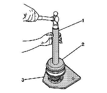 2. Install the input shaft oil deflector using the J 8092 (1) and the J 44746 (2). The J 44746 has an area for installing the oil deflector.