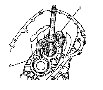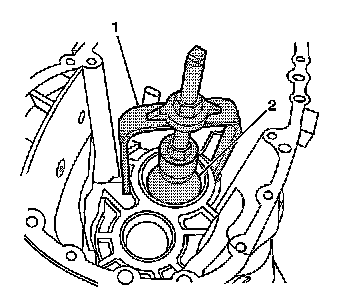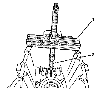 1. With the J 44736 (1) attached to the J 44733 (2), hit the forcing screw in order to bend the input gear oil deflector. This allows the J 44733 (2) to fit under the bearing race.