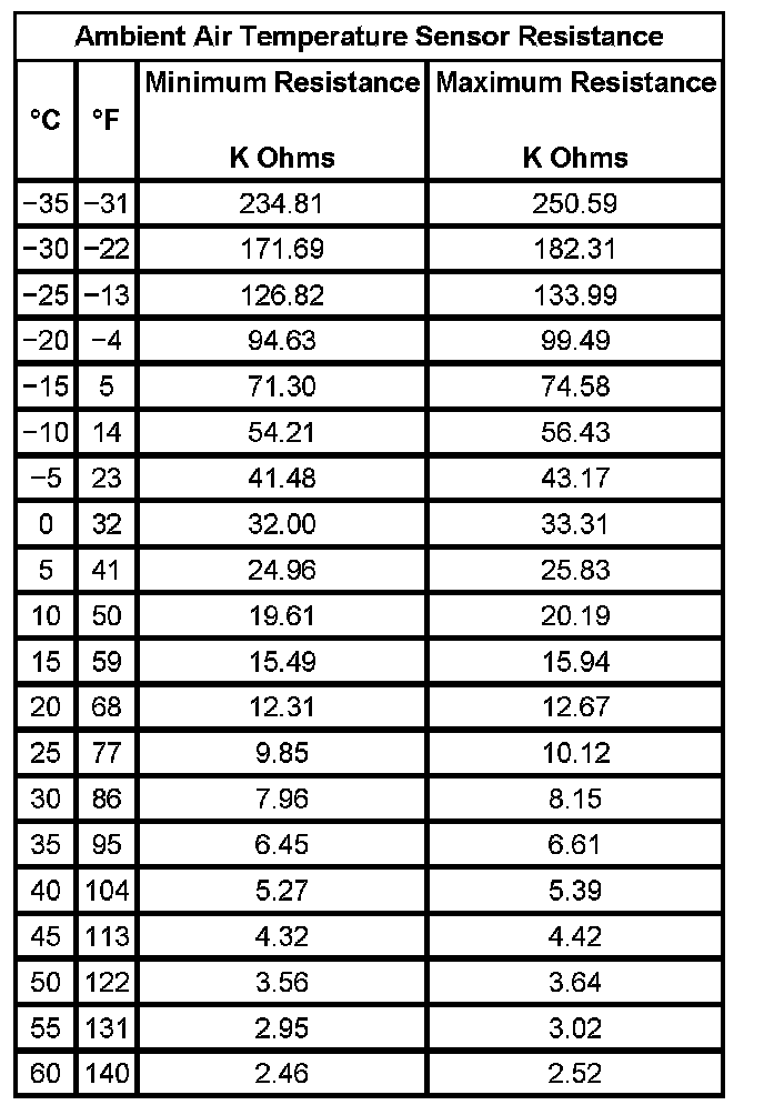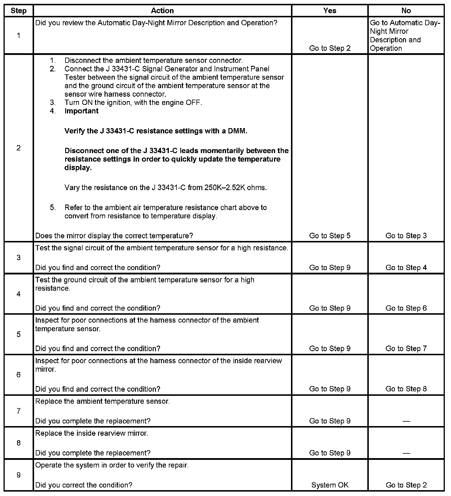The table will be used to measure the resistance of the sensor and compare it with the actual ambient temperature. The mirrors temperature accuracy should be within 5 degrees of the actual temperature. The actual temperature should not be taken from a radio station, a sign displaying the temperature, etc. A temperature measuring tool such as a thermometer should be used. Some temperature measuring tools may be within 5 degrees of the actual temperature. Make sure to consult the manufacturer for the accuracy of the tool. This comparison can make the mirror seem off by 5-10 degrees of the actual temperature when it is not.