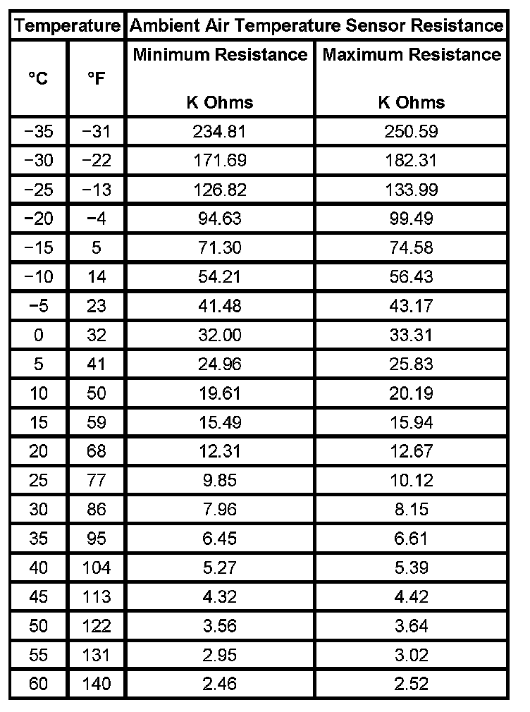 AMBIENT AIR TEMPERATURE SENSOR RESISTANCE TABLE