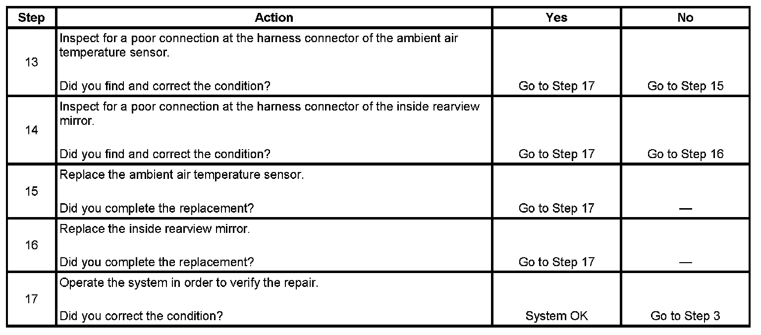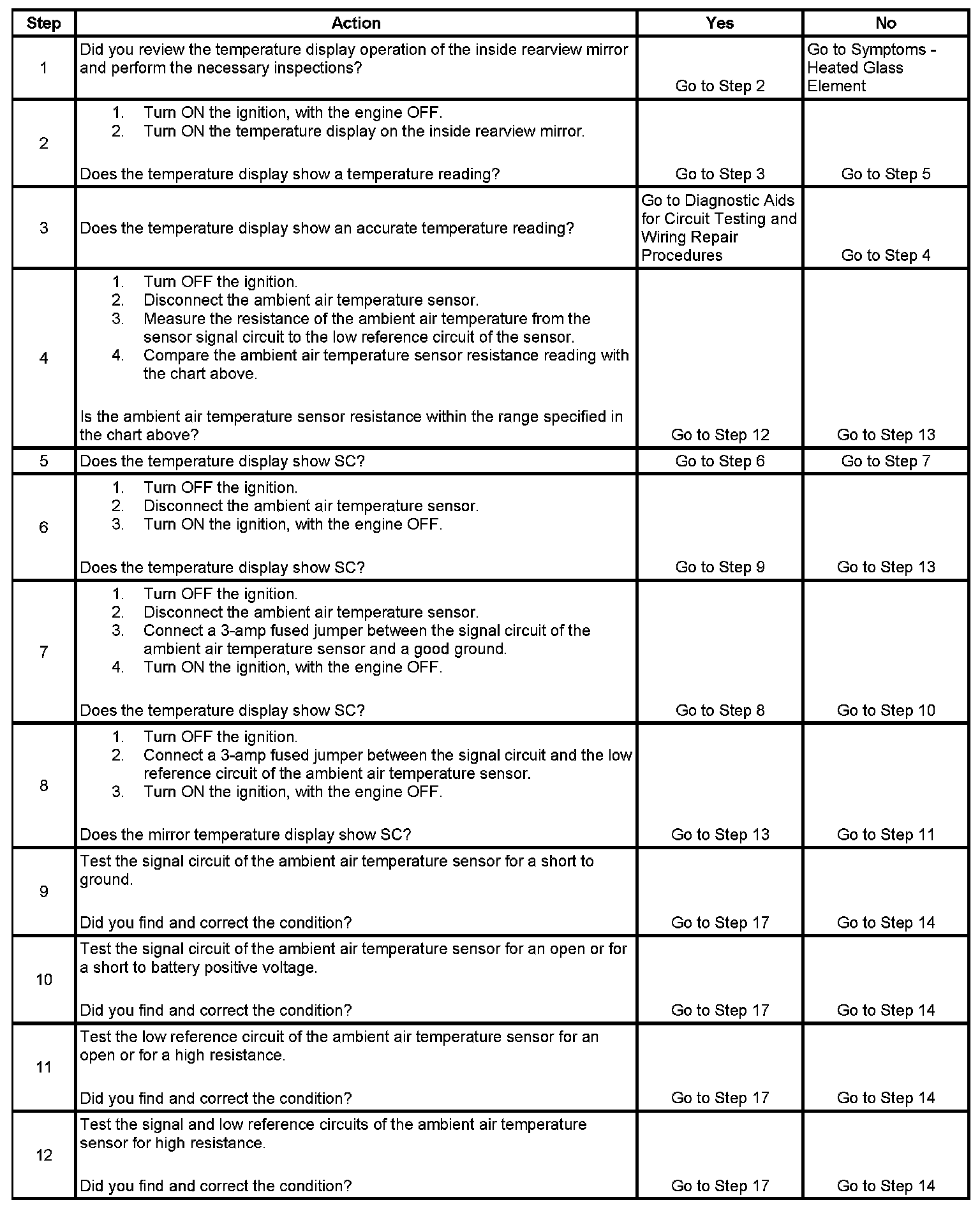 The table will be used to measure the resistance of the sensor and compare it with the actual ambient temperature. The mirrors temperature accuracy should be within 5 degrees of the actual temperature. The actual temperature should not be taken from a radio station, a sign displaying the temperature, etc. A temperature measuring tool such as a thermometer should be used. Some temperature measuring tools may be within 5 degrees of the actual temperature. Make sure to consult the manufacturer for the accuracy of the tool. This comparison can make the mirror seem off by 5-10 degrees of the actual temperature when it is not.